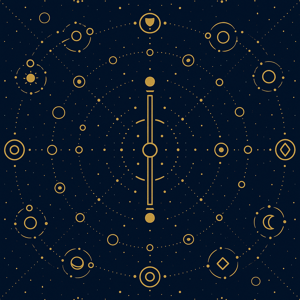 • 13 miniature planet glyphs arranged in fluid orbit chains